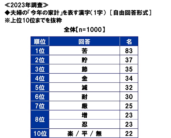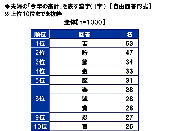 全回答者(1,000名)に、夫婦の“今年の家計”を表す漢字(1字)を聞いたところ、1位「苦」(63名)、2位「貯」(47名)、3位「節」(34名)、4位「金」(33名)、5位「厳」(31名)と続きました。