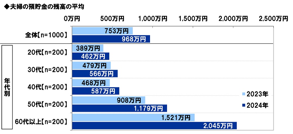 昨年の調査結果と比較すると、夫婦の預貯金の残高の平均は2023年753万円→2024年968万円と、215万円増加しました。年代別にみると、60代以上では524万円増加(2023年1,521万円→2024年2,045万円)と、他の年代と比べて増加幅が大きくなりました。