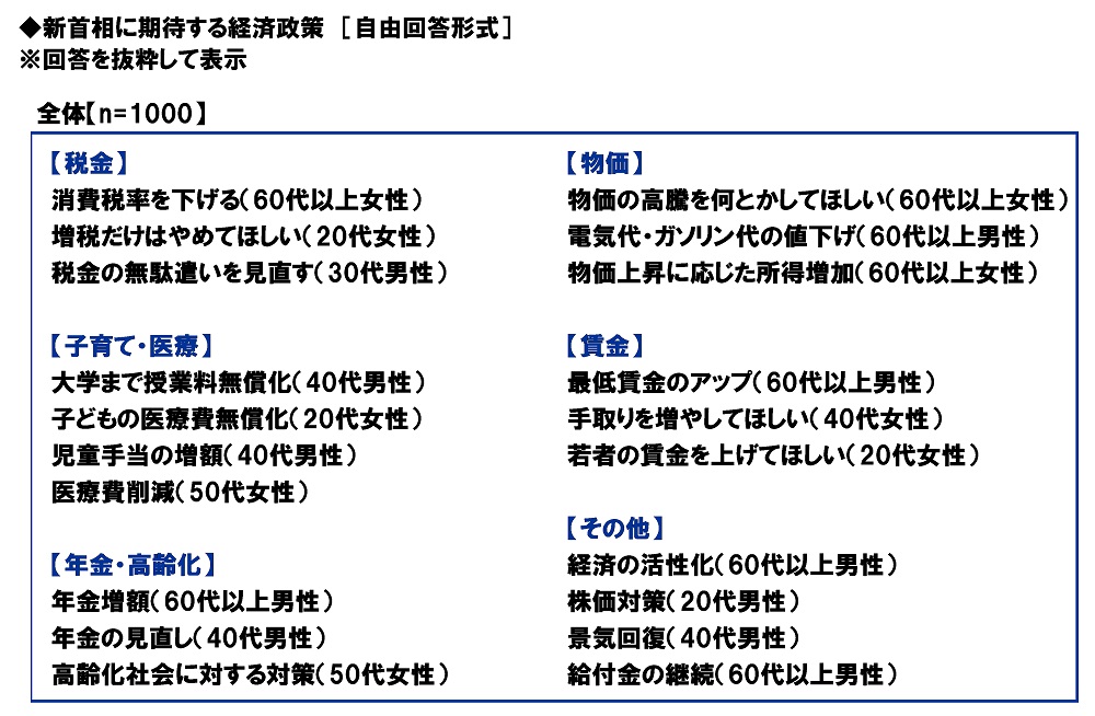 全回答者(1,000名)に、新首相に期待する経済政策を聞いたところ、税金関連では「消費税率を下げる(60代以上女性)」や「増税だけはやめてほしい(20代女性)」、物価関連では「物価の高騰を何とかしてほしい(60代以上女性)」や「電気代・ガソリン代の値下げ(60代以上男性)」、子育て・医療関連では「大学まで授業料無償化(40代男性)」や「医療費削減(50代女性)」、賃金関連では「最低賃金のアップ(60代以上男性)」や「若者の賃金を上げてほしい(20代女性)」、年金・高齢化関連では「年金の見直し(40代男性)」や「高齢化社会に対する対策(50代女性)」といった回答が挙げられました。