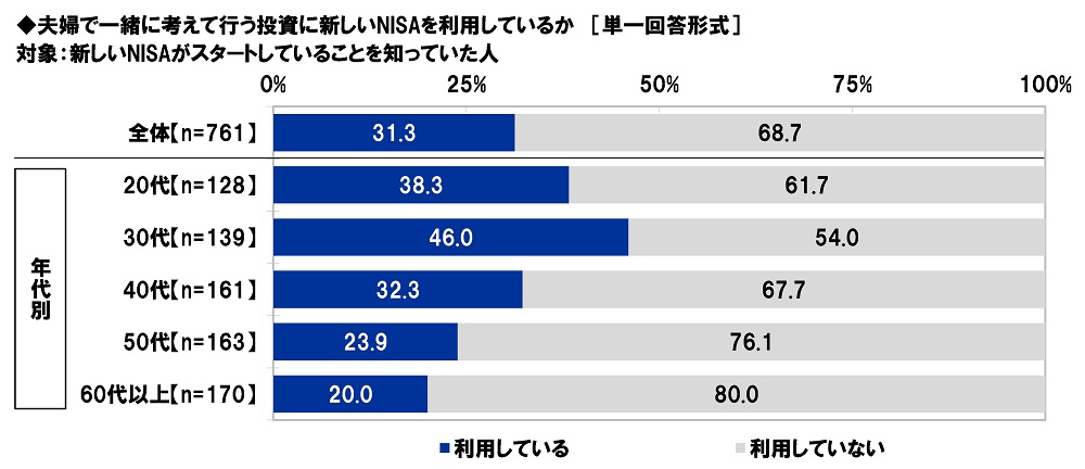 新しいNISAがスタートしていることを知っていた人(761名)に、夫婦で一緒に考えて行う投資に新しいNISAを利用しているか聞いたところ、「利用している」は31.3%、「利用していない」は68.7%となりました。