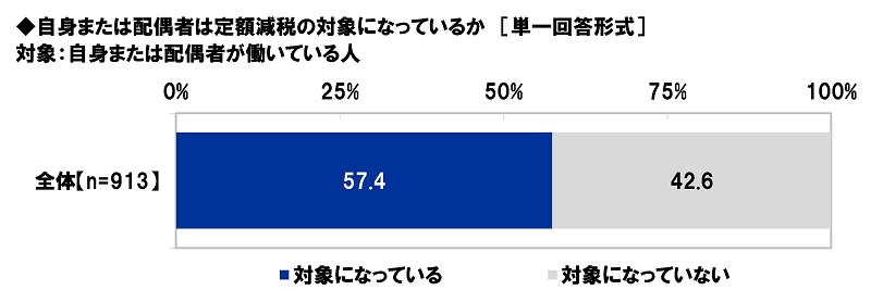 自身または配偶者が働いている人(913名)に、自身または配偶者は定額減税の対象になっているか聞いたところ、「対象になっている」は57.4%、「対象になっていない」は42.6%でした。