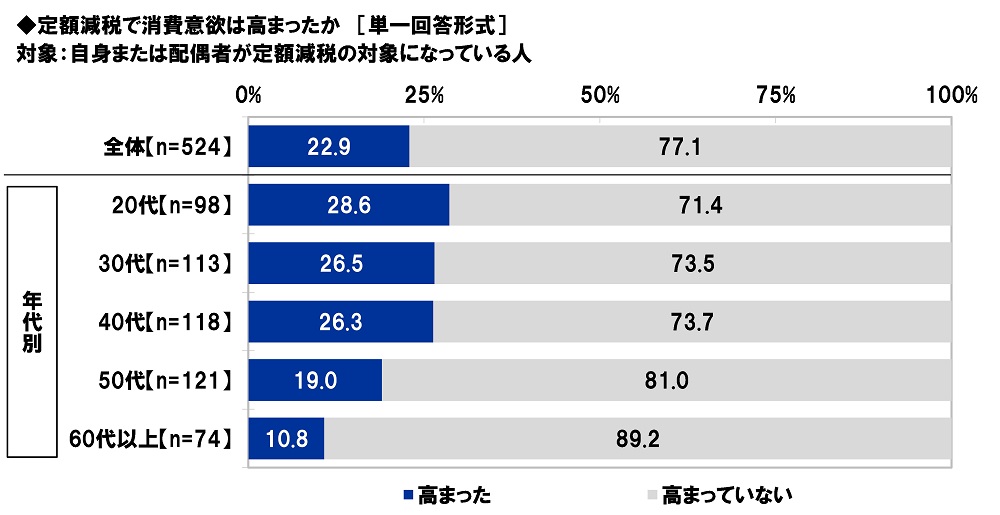自身または配偶者が定額減税の対象になっている人(524名)に、定額減税で消費意欲は高まったか聞いたところ、「高まった」は22.9%、「高まっていない」は77.1%となりました。