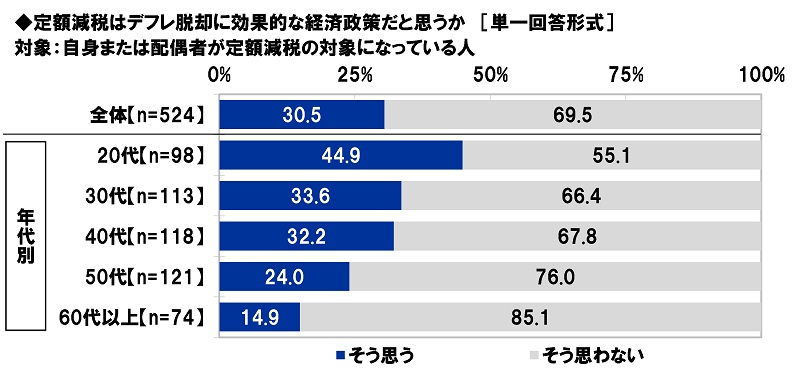 定額減税はデフレ脱却に効果的な経済政策だと思うか聞いたところ、「そう思う」は30.5%、「そう思わない」は69.5%となりました。