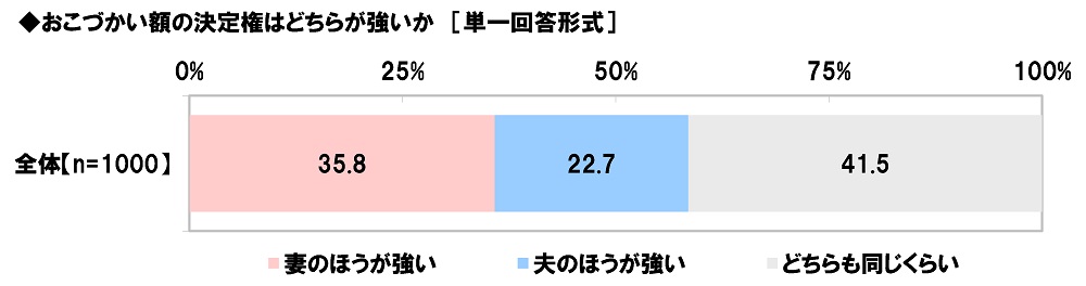 全回答者(1,000名)に、おこづかい額の決定権はどちらが強いか聞いたところ、「妻のほうが強い」は35.8%、「夫のほうが強い」は22.7%、「どちらも同じくらい」は41.5%となりました。