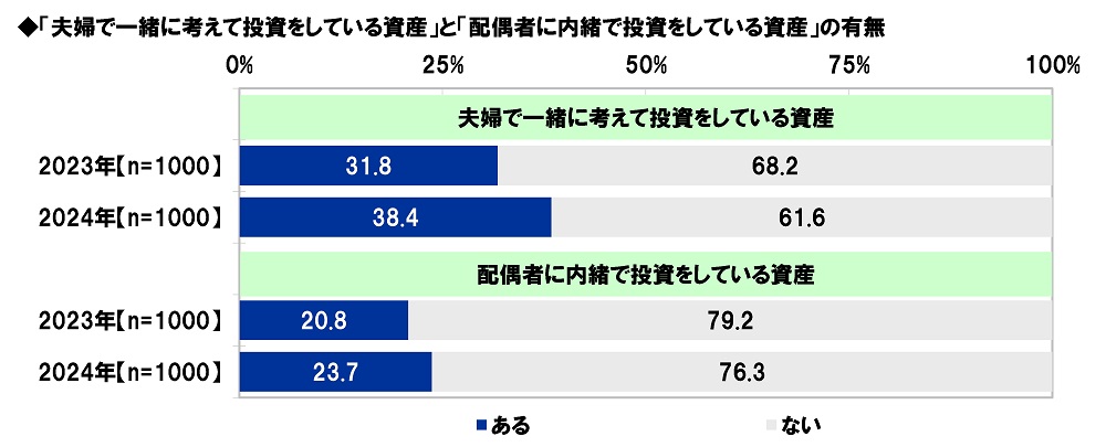 昨年の調査結果と比較すると、“夫婦で一緒に考えて投資をしている資産”がある人の割合は、2023年31.8%→2024年38.4%と6.6ポイント上昇しました。新しいNISAのスタートなどが後押しとなってか、夫婦で相談しながら投資に取り組む人が増えているようです。また、“配偶者に内緒で投資をしている資産”がある人の割合は、2023年20.8%→2024年23.7%と2.9ポイント上昇しました。