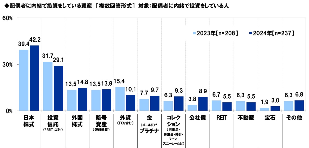 配偶者に内緒で投資をしている人(237名)に、配偶者に内緒で投資をしている資産を聞いたところ、「日本株式」(42.2%)が最も高くなり、「投資信託(「REIT」以外)」(29.1%)、「外国株式」(14.8%)、「暗号資産(仮想通貨)」(13.9%)、「外貨(FXを含む)」(10.1%)が続きました。