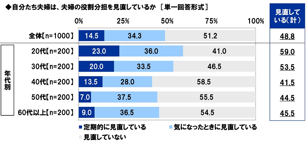 「夫婦の役割分担を見直している」49%、20代では59%