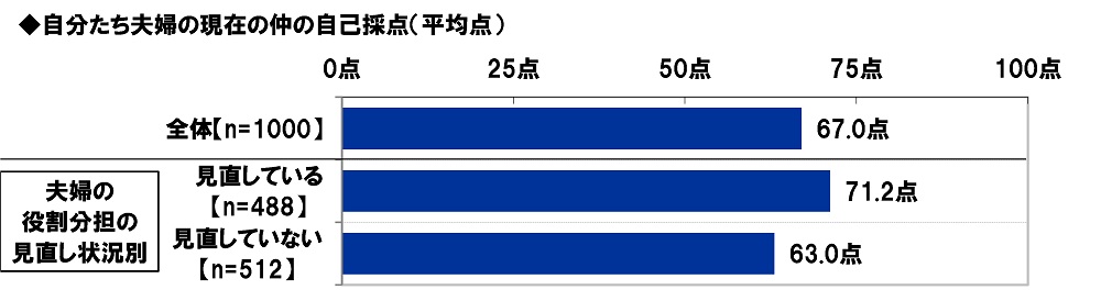 夫婦円満度の自己採点 平均は67点、夫婦の役割分担を見直している人では71点