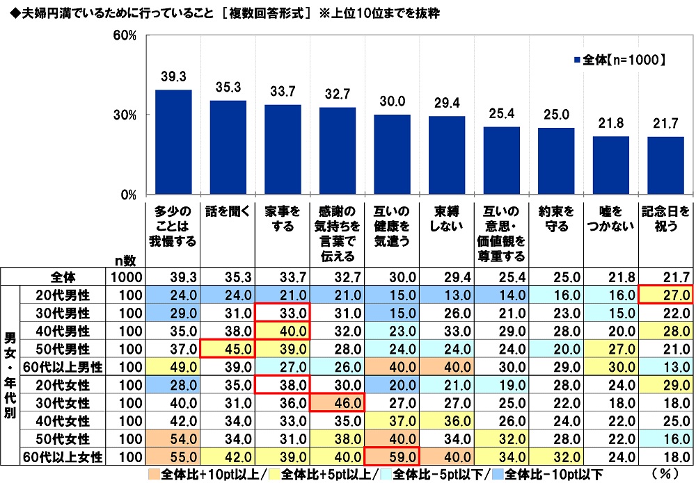 男女・年代別にみると、20代男性では「記念日を祝う」(27.0%)、30代男性、40代男性、20代女性では「家事をする」(順に33.0%、40.0%、38.0%)、50代男性では「話を聞く」(45.0%)、30代女性では「感謝の気持ちを言葉で伝える」(46.0%)、60代以上女性では「互いの健康を気遣う」(59.0%)が1位となりました。