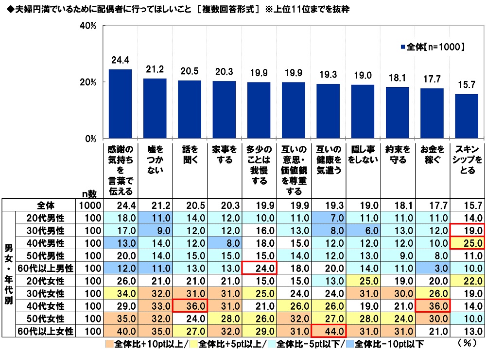 男女・年代別にみると、30代男性と40代男性では「スキンシップをとる」(順に19.0%、25.0%)、60代以上男性では「多少のことは我慢する」(24.0%)、40代女性では「話を聞く」と「お金を稼ぐ」(いずれも36.0%)、60代以上女性では「互いの健康を気遣う」(44.0%)が1位でした。