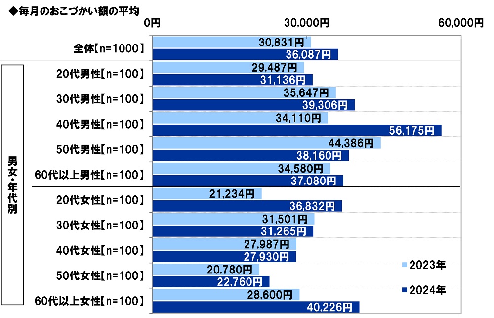 昨年の調査結果と比較すると、毎月のおこづかい額の平均は、2023年30,831円→2024年36,087円と、5,256円増加しました。男女・年代別にみると、毎月のおこづかい額の平均は、40代男性では22,065円増加(2023年34,110円→2024年56,175円)、20代女性では15,598円増加(2023年21,234円→2024年36,832円)、60代以上女性では11,626円増加(2023年28,600円→2024年40,226円)と、それぞれ10,000円以上の大幅増加となりました。