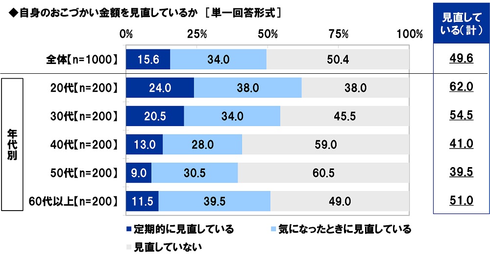 全回答者(1,000名)に、自身のおこづかい金額を見直しているか聞いたところ、「定期的に見直している」は15.6%、「気になったときに見直している」は34.0%で、合計した『見直している(計)』は49.6%、「見直していない」は50.4%となりました。