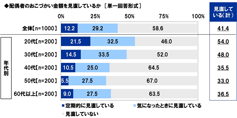 また、配偶者のおこづかい金額を見直しているか聞いたところ、「定期的に見直している」は12.2%、「気になったときに見直している」は29.2%で、合計した『見直している(計)』は41.4%、「見直していない」は58.6%となりました。