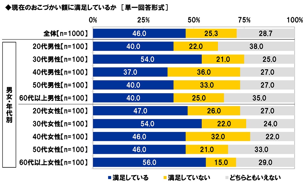 「毎月のおこづかい額に満足している」46%、60代以上女性では56%