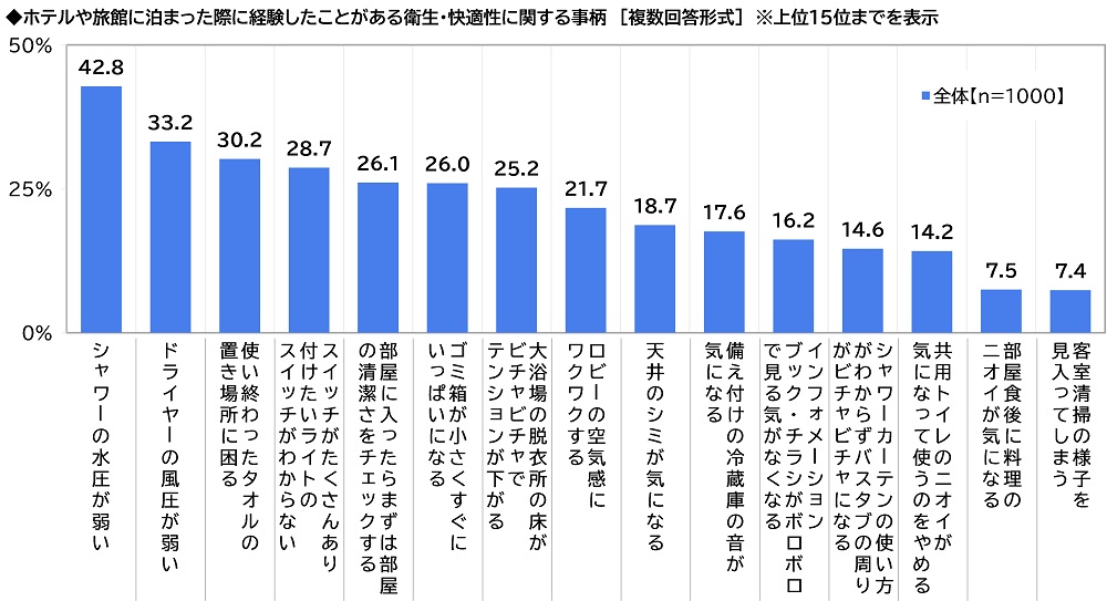 はじめに、全回答者(1,000名)に、ホテルや旅館に泊まった際に経験したことがある衛生・快適性に関する事柄を聞いたところ、「シャワーの水圧が弱い」(42.8%)が最も高くなり、「ドライヤーの風圧が弱い」(33.2%)、「使い終わったタオルの置き場所に困る」(30.2%)、「スイッチがたくさんあり付けたいライトのスイッチがわからない」(28.7%)が続きました。部屋の設備・アメニティの使用感や使い方に関して戸惑った経験のある人が多いようです。