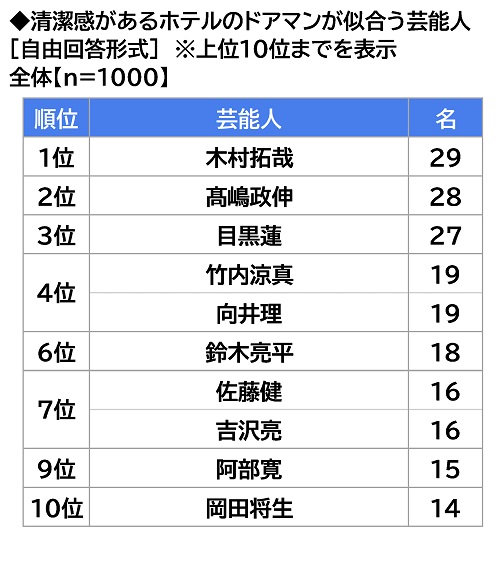 清潔感があるホテルのドアマンが似合う芸能人を聞いたところ、1位「木村拓哉さん」(29名)、2位「髙嶋政伸さん」(28名)、3位「目黒蓮さん」(27名)となりました。