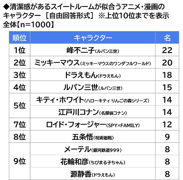 清潔感があるスイートルームが似合うアニメ・漫画のキャラクターを聞いたところ、1位「峰不二子(ルパン三世)」(22名)、2位「ミッキーマウス(ミッキーマウスのワンダフルワールド)」(20名)、3位「ドラえもん(ドラえもん)」(18名)となりました。