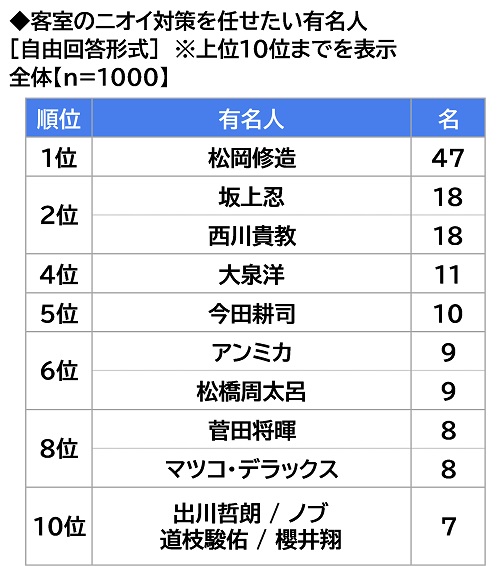 客室のニオイ対策を任せたい有名人を聞いたところ、「松岡修造さん」(47名)がダントツとなり、2位「坂上忍さん」「西川貴教さん」(いずれも18名)が続きました。