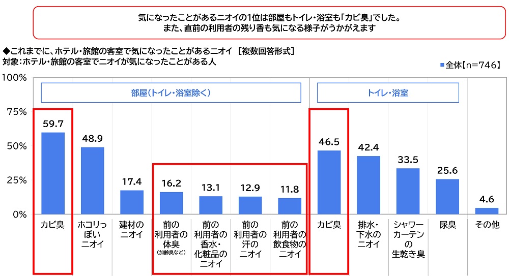ホテル・旅館の客室でニオイが気になったことがある人(746名)に、これまでに、ホテル・旅館の客室で気になったことがあるニオイを聞いたところ、【部屋(トイレ・浴室除く)】については「カビ臭」(59.7%)が最も高くなり、「ホコリっぽいニオイ」(48.9%)、「建材のニオイ」(17.4%)が続きました。【トイレ・浴室】については「カビ臭」(46.5%)が最も高くなり、「排水・下水のニオイ」(42.4%)、「シャワーカーテンの生乾き臭」(33.5%)が続きました。部屋や水回りのカビ臭さが気になったという人が多いようです。