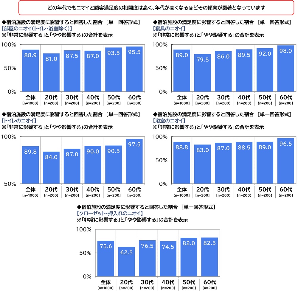 いずれのニオイにおいても、宿泊施設の満足度に影響を与えると思う人が全世代で多数を占める結果となりました。宿泊施設にとって、客室や水回りのニオイを除去し高い快適性を保つことは、宿泊者の満足度を高めリピートを促すための必須条件といえるのではないでしょうか。