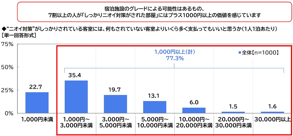 全回答者(1,000名)に、“ニオイ対策”がしっかりされている客室には、何もされていない客室よりいくら多く支払ってもいいと思うか(1人1泊あたり)聞いたところ、「1,000円~3,000円未満」(35.4%)に回答が集まりました。