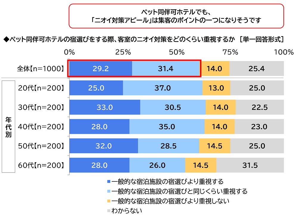 全回答者(1,000名)に、ペット同伴可ホテルの宿選びをする際、客室のニオイ対策をどのくらい重視するか聞いたところ、「一般的な宿泊施設の宿選びより重視する」は29.2%となりました。ペット連れで宿泊できるホテルの場合、ペット特有のニオイが気になるためか、客室のニオイ対策をより入念にチェックして宿を選ぶ人が少なくないようです。また、「一般的な宿泊施設の宿選びと同じくらい重視する」は31.4%でした。