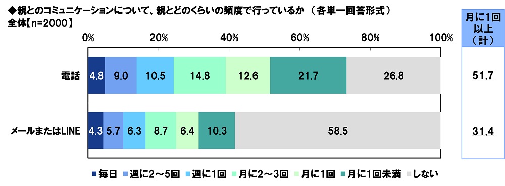 まず、全回答者(2,000名)に、親とのコミュニケーションの頻度を聞いたところ、【電話】は「しない」(26.8%)が最も多く、「月に1回未満」(21.7%)、「月に2~3回」(14.8%)が続き、「毎日」電話する人も4.8%いました。「月に1回」までを合計した「月に1回以上」は51.7%となりました。また、【メールまたはLINE】は「しない」(58.5%)が最も多く、「月に1回以上」は31.4%となりました。