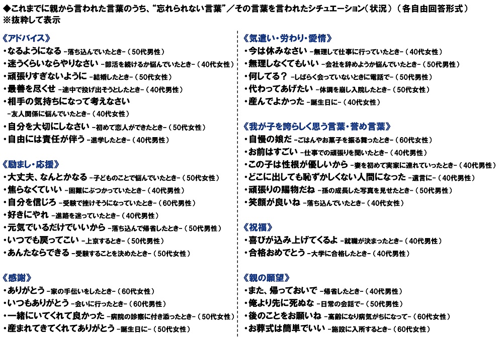 これまでに親から言われた言葉のうち、“忘れられない言葉”を聞いたところ、「迷うくらいならやりなさい -部活を続けるか悩んでいたとき-」「頑張りすぎないように -結婚したとき-」「最善を尽くせ -途中で投げ出そうとしたとき-」といったアドバイス、「大丈夫、なんとかなる -子どものことで悩んでいたとき-」「元気でいるだけでいいから -落ち込んで帰省したとき-」といった励まし・応援が多くみられました。