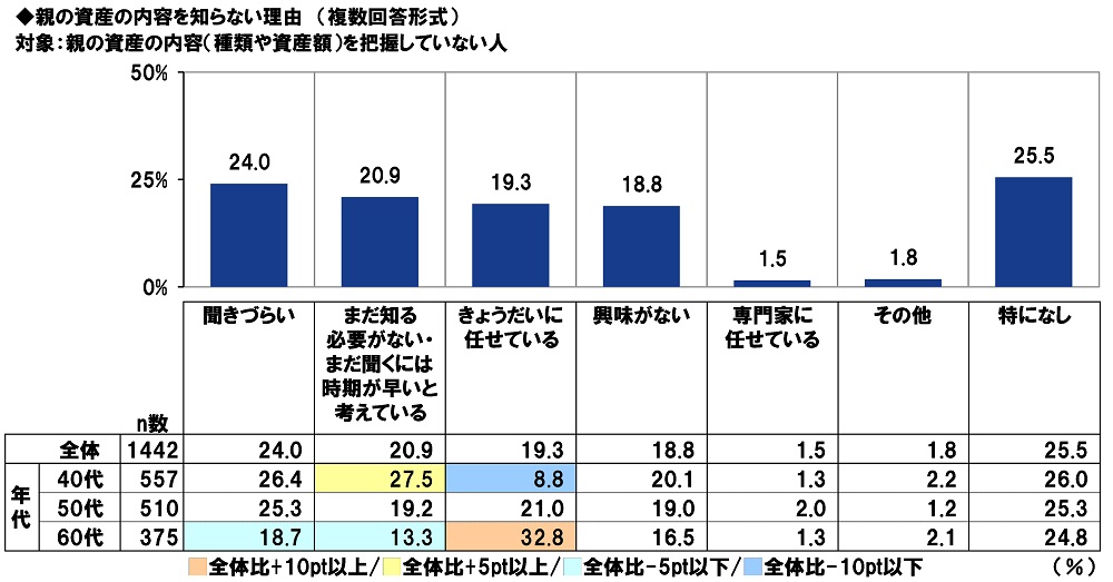親の資産の内容を知らない理由 1位「聞きづらい」、60代では「きょうだいに任せている」が1位