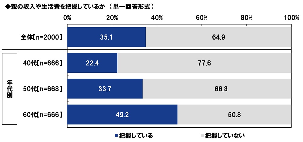 「親の収入や生活費を把握していない」6割半、40代の子では約8割、他方、60代では半数が把握