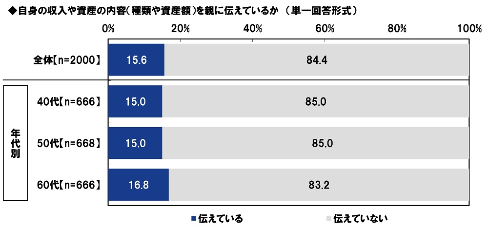 また、自身の収入や資産の内容(種類や資産額)を親に伝えているかを聞いたところ、「伝えている」は15.6%、「伝えていない」は84.4%となりました。