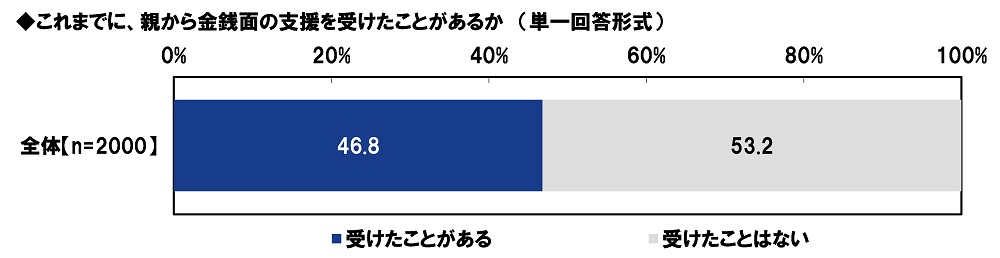 これまでに、親から金銭面の支援を受けたことがあるかを聞いたところ、「受けたことがある」は46.8%、「受けたことはない」は53.2%となりました。