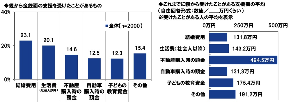 支援額の平均(受けたことがある人)をみると、「結婚費用」は131.8万円、「生活費(社会人以降)」は143.2万円、「不動産購入時の頭金」は494.5万円、「自動車購入時の頭金」は131.3万円、「子どもの教育資金」は175.4万円でした。