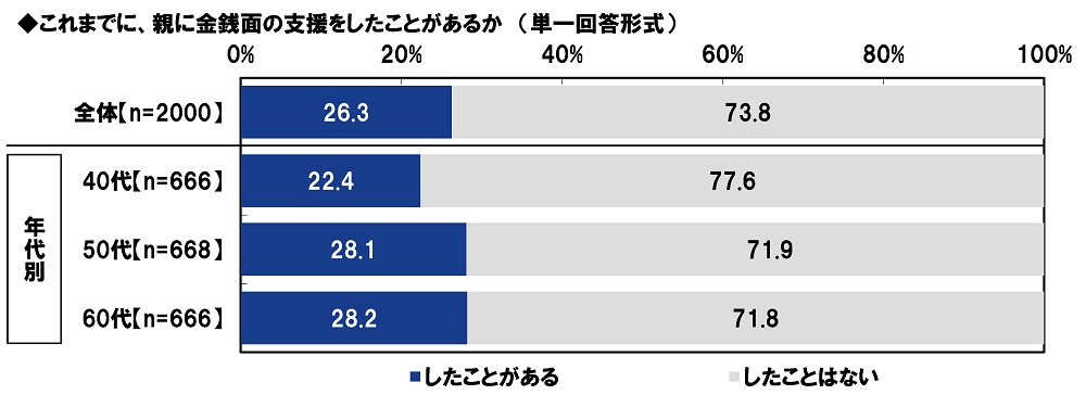 他方、全回答者(2,000名)に、これまでに、親に金銭面の支援をしたことがあるかを聞いたところ、「したことがある」は26.3%、「したことはない」は73.8%となりました。