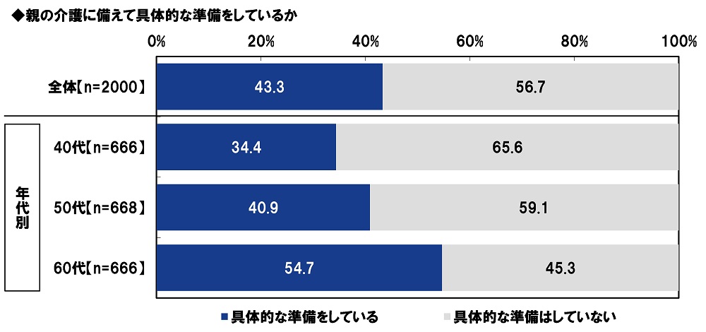 親の介護に備えて具体的な準備をしているかを聞いたところ、「具体的な準備をしている」は43.3%、「具体的な準備はしていない」56.7%となりました。
