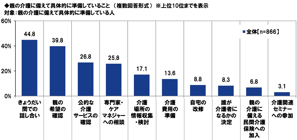 親の介護に備えて具体的に準備している人(866名)に、具体的に準備していることを聞いたところ、「きょうだい間での話し合い」(44.8%)が最も高くなり、「親の希望の確認」(39.8%)、「公的な介護サービスの確認」(26.8%)が続きました。また、「専門家・ケアマネジャーへの相談」(25.8%)や「親の介護に備える民間介護保険への加入」(6.8%)などが上位に挙がりました。介護の専門家などに相談する機会を活用する人や、保険に加入することで将来のリスクに備える人も少なくないようです。