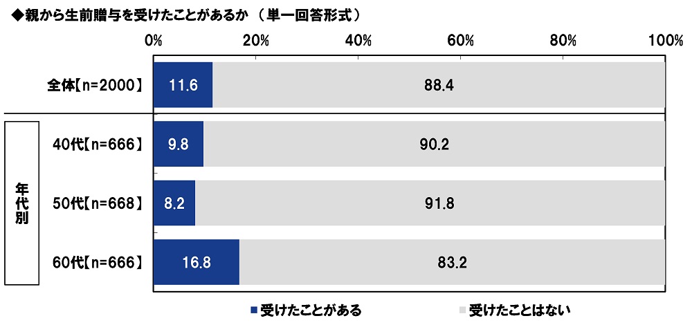 「親から生前贈与を受けたことがある」40代・50代では1割未満、60代では1割半に