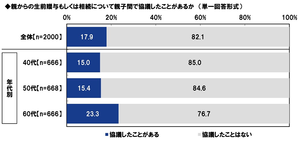 親からの生前贈与もしくは相続について親子間で協議したことがあるかを聞いたところ、「協議したことがある」は17.9%、「協議したことはない」は82.1%となりました。