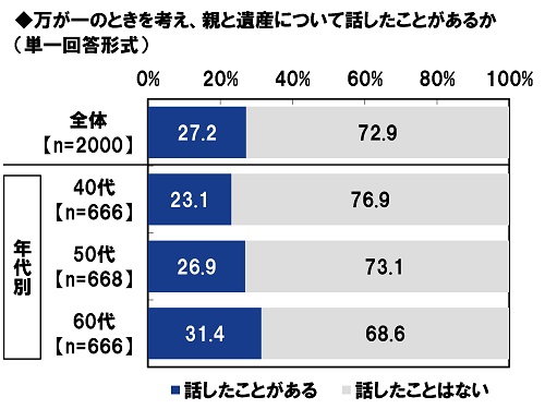 万が一のときを考え、親と遺産について話したことがあるかを聞いたところ、「話したことがある」は27.2%、「話したことはない」は72.9%となり、年代別(40代23.1%、50代26.9%、60代31.4%)ではどの年代においても話したことがある人が少数派でした。