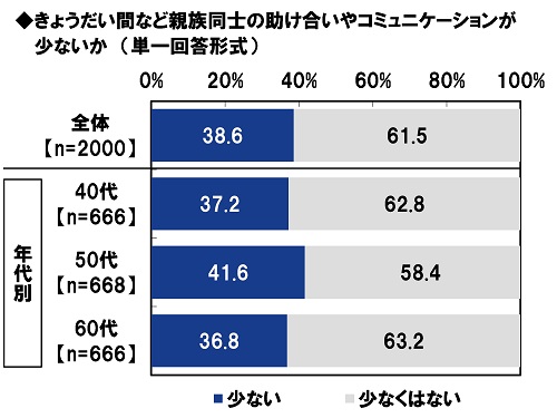 きょうだい間など親族同士の助け合いやコミュニケーションが少ないかを聞いたところ、「少ない」は38.6%、「少なくはない」は61.5%となりました。