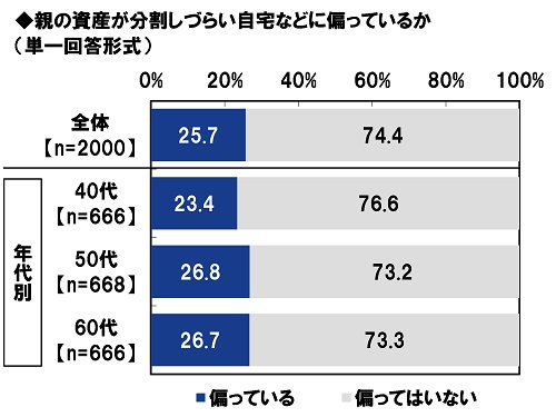 親の資産が分割しづらい自宅などに偏っているかを聞いたところ、「偏っている」は25.7%、「偏ってはいない」は74.4%となりました。