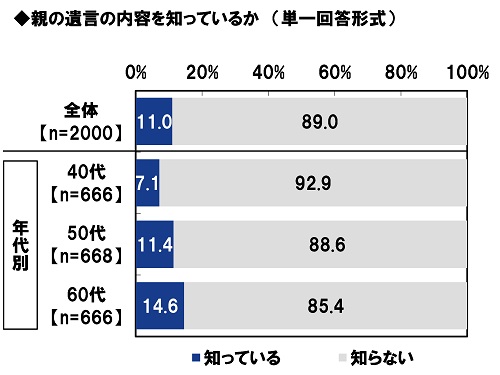 親の遺言の内容を知っているかを聞いたところ、「知っている」は11.0%、「知らない」は89.0%となりました。