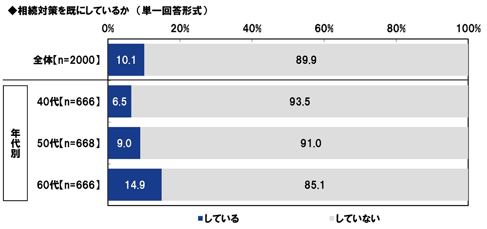 相続対策を既にしているかを聞いたところ、「している」は10.1%、「していない」は89.9%と、大多数が相続対策に着手していない実状が明らかとなりました。