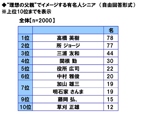 “理想の父親”でイメージする有名人シニアを聞いたところ、フリーアナウンサー・高橋 真麻さんの父親で俳優の「高橋 英樹さん」が1位となり、2位「所 ジョージさん」、3位「三浦 友和さん」、4位「関根 勤さん」、5位「役所 広司さん」と続きました。