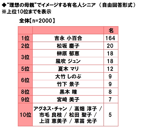 他方、“理想の母親”でイメージする有名人シニアを聞いたところ、映画やドラマで母親役を多く演じている「吉永 小百合さん」がダントツとなり、2位「松坂 慶子さん」、3位「榊原 郁恵さん」「風吹 ジュンさん」、5位「夏木 マリさん」と続きました。