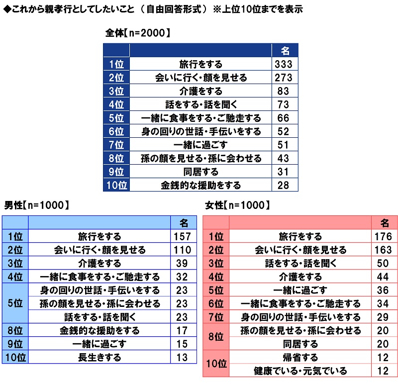 これからしたい親孝行 1位「旅行をする」2位「会いに行く・顔を見せる」3位「介護をする」