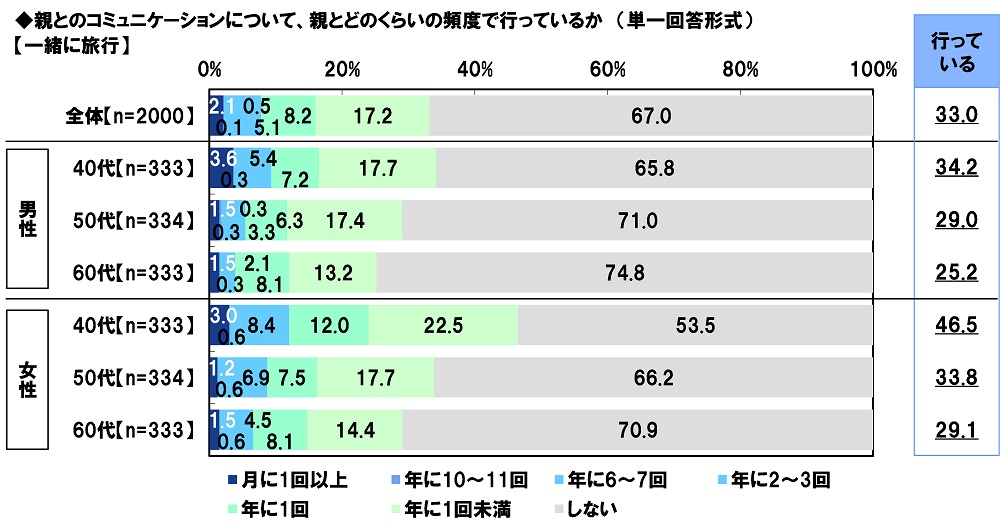 【一緒に旅行】では、「行っている」は33.0%、行っていない人(「しない」)は67.0%となり、「行っている」人のなかでは、「年に1回未満」(17.2%)や「年に1回」(8.2%)などが多くなりました。