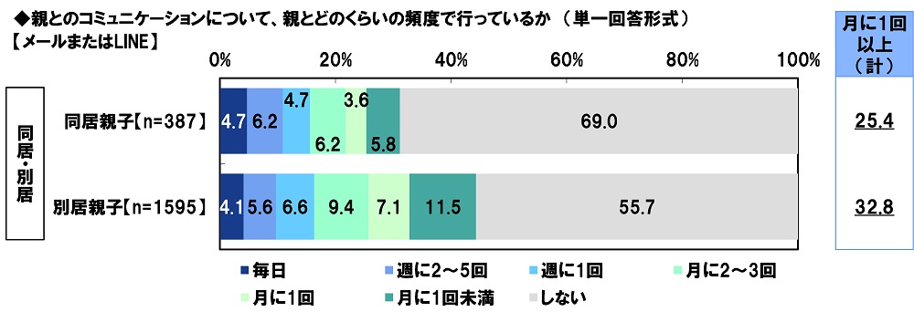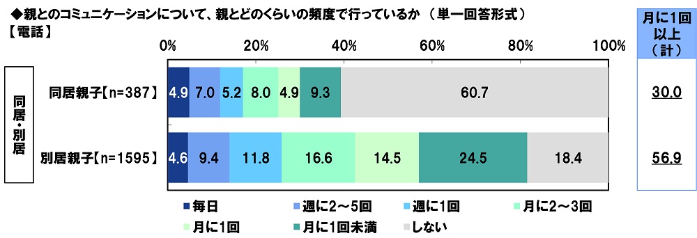 ここで、同居親子と別居親子(※)についてみると、別居親子では【電話】を「月に1回以上」する人の割合は56.9%、「しない」人の割合は18.4%、【メールまたはLINE】を「月に1回以上」する人の割合は32.8%、「しない」人の割合は55.7%となりました。