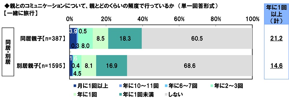 他方、同居親子では、【一緒に旅行】を「年に1回以上」する人の割合は21.2%となりました。