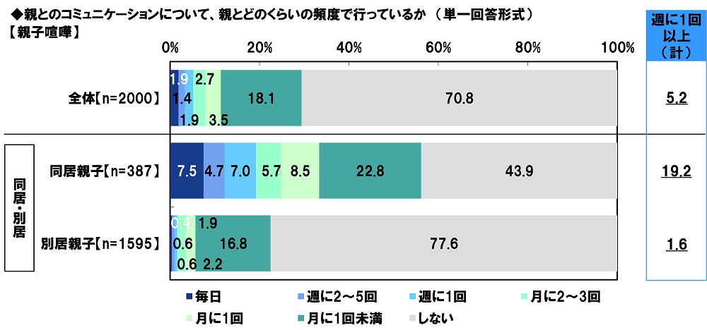 同居親子についてみると、「週に1回以上」は19.2%、「しない」は43.9%となりました。一緒に住んでいることで、些細なことがきっかけとなって親子喧嘩に発展しているケースが多いのではないでしょうか。